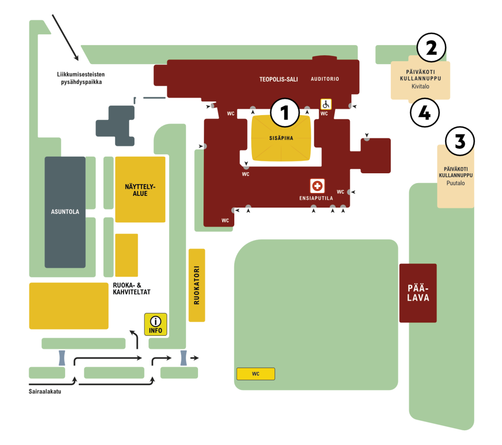 Lauantaina ja sunnuntaina toimintapisteitä ja leikkialueita on lisäksi päiväkoti Kullannupun puurakennuksessa sekä aidatulla pihalla.