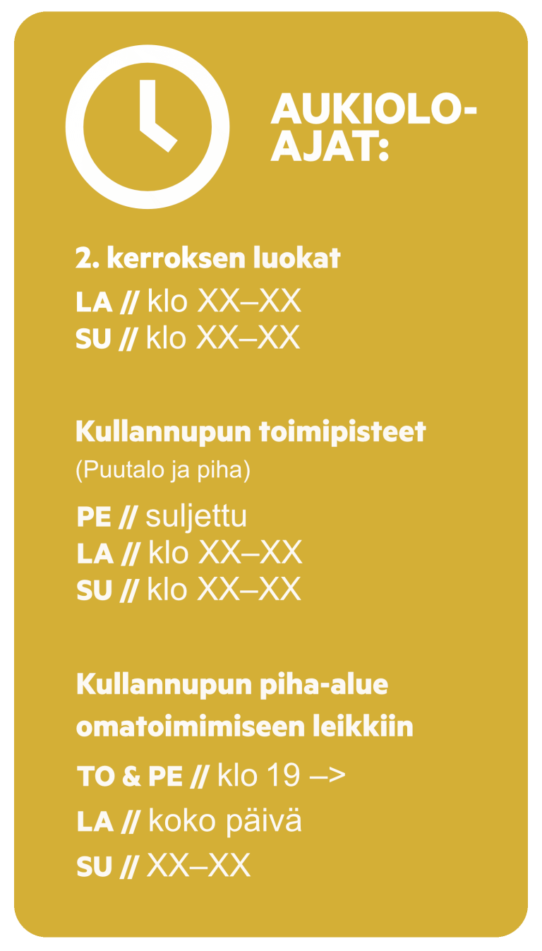 Huomioithan, että vielä perjantaina koko Kullannupun aidattu alue on päiväkodin omassa käytössä, eikä juhlavierailla ole silloin sinne pääsyä. Kullannupun piha-alue aukeaa juhlavieraiden käyttöön perjantaina klo 19.